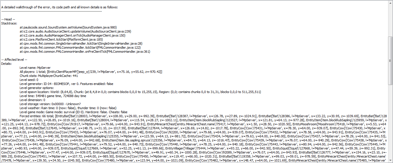 | Description | ---- Minecraft Crash Report ---- // Ooh. Shiny. Time: 4/5/14 12:54 AM Description: Unexpected error java.lang.NullPointerException at paulscode.sound.SoundSystem.setVolume(SoundSystem.java:980) at ic2.core.audio.AudioSourceClient.updateVolume(AudioSourceClient.java:239) at ic2.core.audio.AudioManagerClient.onTick(AudioManagerClient.java:150) at ic2.core.PlatformClient.tickStart(PlatformClient.java:185) at cpw.mods.fml.common.SingleIntervalHandler.tickStart(SingleIntervalHandler.java:28) at cpw.mods.fml.common.FMLCommonHandler.tickStart(FMLCommonHandler.java:122) at cpw.mods.fml.common.FMLCommonHandler.onPreClientTick(FMLCommonHandler.java:361) at net.minecraft.client.Minecraft.func_71407_l(Minecraft.java:1511) at net.minecraft.client.Minecraft.func_71411_J(Minecraft.java:910) at net.minecraft.client.Minecraft.func_99999_d(Minecraft.java:838) at net.minecraft.client.main.Main.main(SourceFile:101) at sun.reflect.NativeMethodAccessorImpl.invoke0(Native Method) at sun.reflect.NativeMethodAccessorImpl.invoke(Unknown Source) at sun.reflect.DelegatingMethodAccessorImpl.invoke(Unknown Source) at java.lang.reflect.Method.invoke(Unknown Source) at net.minecraft.launchwrapper.Launch.launch(Launch.java:131) at net.minecraft.launchwrapper.Launch.main(Launch.java:27) A detailed walkthrough of the error, its code path and all known details is as follows: --------------------------------------------------------------------------------------- -- Head -- Stacktrace: at paulscode.sound.SoundSystem.setVolume(SoundSystem.java:980) at ic2.core.audio.AudioSourceClient.updateVolume(AudioSourceClient.java:239) at ic2.core.audio.AudioManagerClient.onTick(AudioManagerClient.java:150) at ic2.core.PlatformClient.tickStart(PlatformClient.java:185) at cpw.mods.fml.common.SingleIntervalHandler.tickStart(SingleIntervalHandler.java:28) at cpw.mods.fml.common.FMLCommonHandler.tickStart(FMLCommonHandler.java:122) at cpw.mods.fml.common.FMLCommonHandler.onPreClientTick(FMLCommonHandler.java:361) -- Affected level -- Details: Level name: MpServer All players: 1 total; [EntityClientPlayerMP['jeep_xj'/239, l='MpServer', x=75.16, y=55.62, z=-970.42]] Chunk stats: MultiplayerChunkCache: 441 Level seed: 0 Level generator: ID 04 - BIOMESOP, ver 0. Features enabled: false Level generator options: Level spawn location: World: (8,64,8), Chunk: (at 8,4,8 in 0,0; contains blocks 0,0,0 to 15,255,15), Region: (0,0; contains chunks 0,0 to 31,31, blocks 0,0,0 to 511,255,511) Level time: 549481 game time, 724088 day time Level dimension: 0 Level storage version: 0x00000 - Unknown? Level weather: Rain time: 0 (now: false), thunder time: 0 (now: false) Level game mode: Game mode: survival (ID 0). Hardcore: false. Cheats: false Forced entities: 66 total; [EntityBat['Bat'/128003, l='MpServer', x=108.00, y=29.00, z=-992.39], EntityBat['Bat'/128387, l='MpServer', x=126.78, y=27.89, z=-1024.91], EntityBat['Bat'/128386, l='MpServer', x=133.22, y=30.95, z=-1039.69], EntityBat['Bat'/128389, l='MpServer', x=122.50, y=26.85, z=-1019.16], EntityBat['Bat'/128004, l='MpServer', x=115.54, y=28.27, z=-1002.11], EntityItem['item.blockRubSapling'/123527, l='MpServer', x=121.81, y=64.13, z=-977.28], EntityItem['item.blockRubSapling'/125959, l='MpServer', x=121.25, y=64.13, z=-978.72], EntityCow['Cow'/91917, l='MpServer', x=79.66, y=64.00, z=-943.91], EntityMinecartChest['entity.MinecartChest.name'/75417, l='MpServer', x=1.50, y=28.50, z=-1020.50], EntityMooshroom['Mooshroom'/75418, l='MpServer', x=5.53, y=64.00, z=-892.34], EntityBat['Bat'/127645, l='MpServer', x=148.75, y=31.10, z=-1017.59], EntityBat['Bat'/127644, l='MpServer', x=126.69, y=14.82, z=-1017.78], EntityCow['Cow'/75431, l='MpServer', x=78.30, y=64.00, z=-939.07], EntityCow['Cow'/75430, l='MpServer', x=80.73, y=64.00, z=-943.91], EntityCow['Cow'/75433, l='MpServer', x=76.07, y=64.00, z=-941.48], EntityCow['Cow'/92200, l='MpServer', x=79.68, y=64.00, z=-939.07], EntityCow['Cow'/75432, l='MpServer', x=78.58, y=64.00, z=-943.91], EntityCow['Cow'/75435, l='MpServer', x=77.21, y=64.00, z=-940.39], EntityItem['item.blockRubSapling'/125355, l='MpServer', x=123.59, y=64.13, z=-981.72], EntityCow['Cow'/75434, l='MpServer', x=79.63, y=64.00, z=-940.00], EntityCow['Cow'/75437, l='MpServer', x=78.29, y=64.00, z=-941.53], EntityCow['Cow'/75436, l='MpServer', x=76.09, y=64.00, z=-942.68], EntityItem['item.tile.sapling.spruce'/125356, l='MpServer', x=84.72, y=64.13, z=-1016.47], EntityCow['Cow'/75439, l='MpServer', x=76.07, y=64.00, z=-940.29], EntityCow['Cow'/75438, l='MpServer', x=77.26, y=64.00, z=-941.49], EntityCow['Cow'/75441, l='MpServer', x=79.52, y=64.00, z=-940.73], EntityCow['Cow'/75440, l='MpServer', x=78.25, y=64.00, z=-940.18], EntityCow['Cow'/75443, l='MpServer', x=80.94, y=64.00, z=-942.56], EntityCow['Cow'/75445, l='MpServer', x=80.93, y=64.00, z=-939.07], EntitySquid['Squid'/127669, l='MpServer', x=52.25, y=61.13, z=-999.66], EntityVillager['Villager'/75444, l='MpServer', x=93.22, y=66.00, z=-942.50], EntitySquid['Squid'/127668, l='MpServer', x=47.44, y=59.39, z=-992.31], EntityCow['Cow'/75446, l='MpServer', x=77.47, y=64.00, z=-939.07], EntitySquid['Squid'/127670, l='MpServer', x=49.91, y=60.34, z=-1000.28], EntityCow['Cow'/92089, l='MpServer', x=76.07, y=64.00, z=-943.93], EntityBat['Bat'/126777, l='MpServer', x=154.16, y=23.10, z=-989.25], EntityCow['Cow'/75451, l='MpServer', x=107.72, y=64.00, z=-985.50], EntityCow['Cow'/75450, l='MpServer', x=119.47, y=66.00, z=-1020.31], EntityBat['Bat'/119358, l='MpServer', x=99.03, y=59.01, z=-978.59], EntityMinecartChest['entity.MinecartChest.name'/75478, l='MpServer', x=139.50, y=34.50, z=-1045.50], EntityCow['Cow'/75480, l='MpServer', x=123.94, y=64.00, z=-1021.09], EntityCow['Cow'/75482, l='MpServer', x=148.47, y=64.00, z=-1021.69], EntityMinecartChest['entity.MinecartChest.name'/75485, l='MpServer', x=154.50, y=31.50, z=-1028.50], EntityCow['Cow'/75487, l='MpServer', x=153.28, y=64.00, z=-1022.50], EntityCow['Cow'/91999, l='MpServer