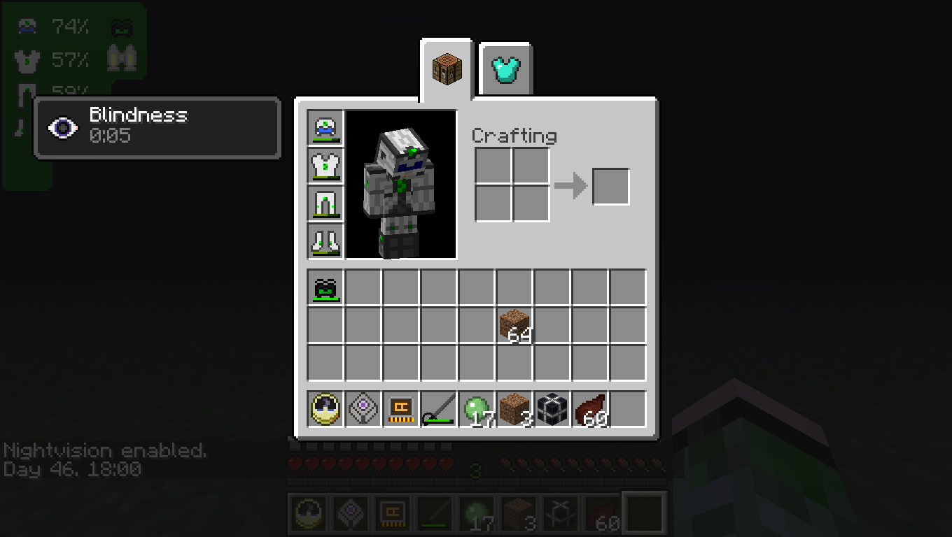 | Description | when i turn on Quantum helmet nightvision at night,i have blindness but nano helment and just nightvision are fine why? ic2 build 500 minecraft version 1.7.10 | ||||