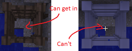 Another example of this is if you make a 2 by 2 of wood or nether brick fences, as you can drop in-between into the hole. Trying to do this with iron fences results in you only being able to walk on the top of them.