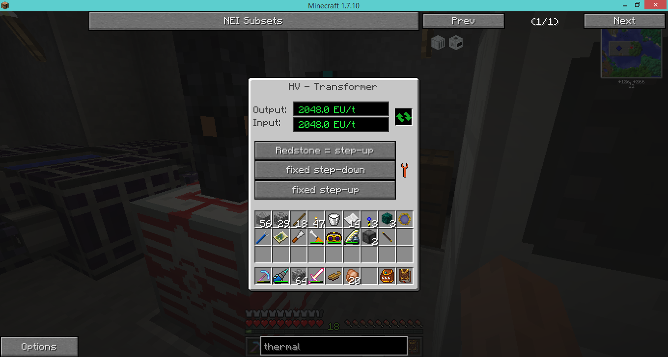 | Description | Output and input eu/t from hv transformer is the same - 2048 eu/t. Force refresh is not working, only blinks for a moment 512 eu/t on output, but it return to 2048 eu/t. IC2 .640 Forge .1208 | ||||