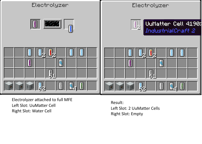 | Steps To Reproduce | (left and right slots refer to the slots in Electrolyzer) --Using Full MFE-- Empty Cell in left slot, leave right slot empty: Empty Cell consumed, Electrolyzed Water Cell placed in right slot. Lava Cell in left slot, Compressed Air Cell in right slot: Lava Cell consumed, right slot now contains 2 Compressed Air Cells --Using Empty MFE-- Left slot empty, Empty Cell in right slot: Empty Cell in right slot consumed, Water Cell placed in left slot. UuMatter Cell in left slot, Water Cell in right slot: Water Cell in right slot consumed, left slot now contains 2 UuMatter Cells. (See attached electrolyzer_duplicate image) | ||||