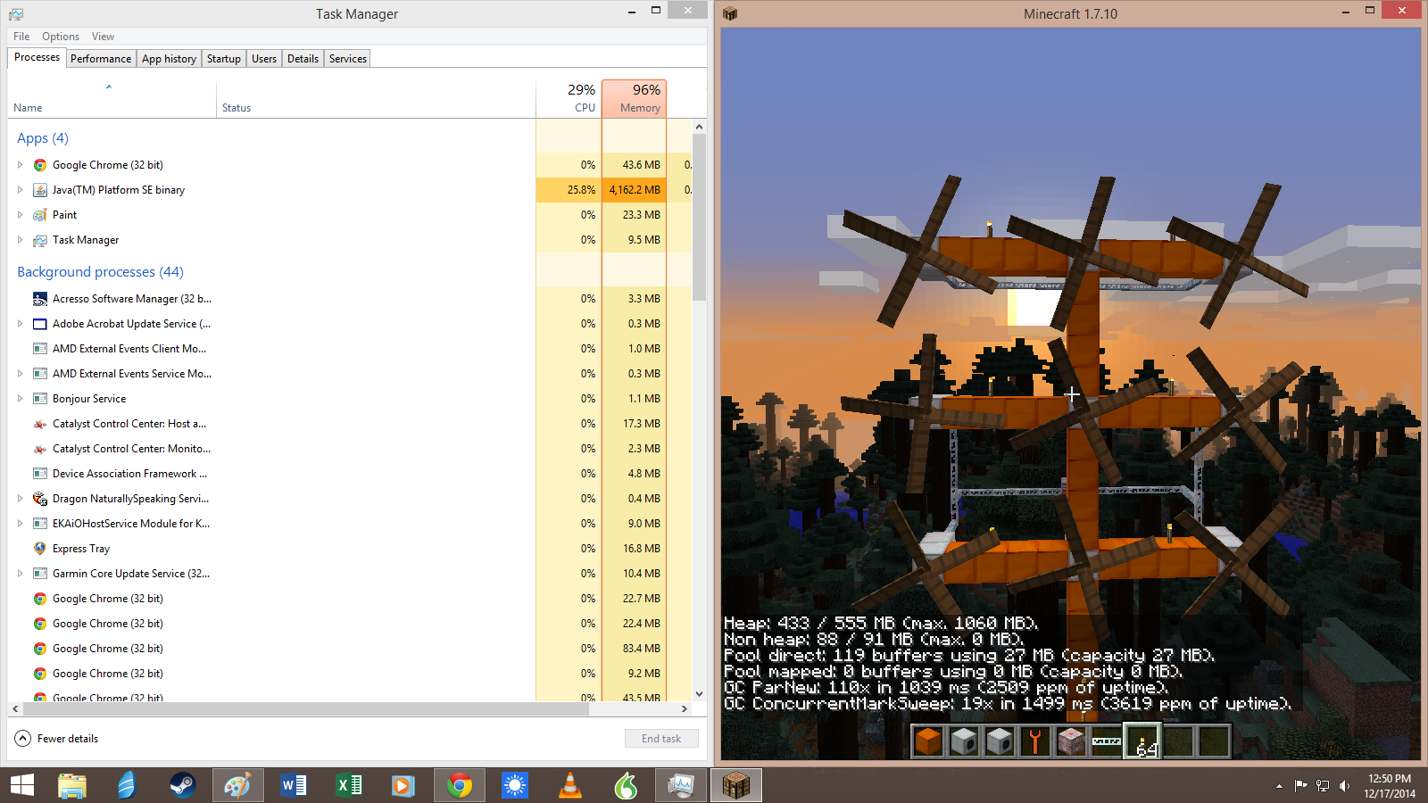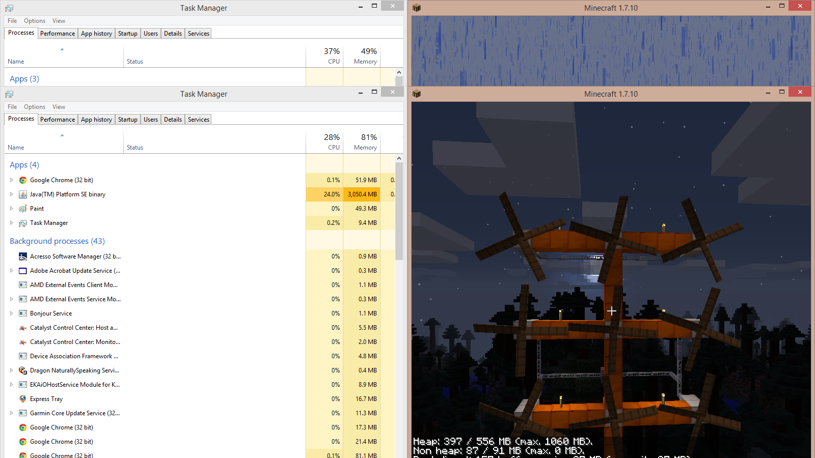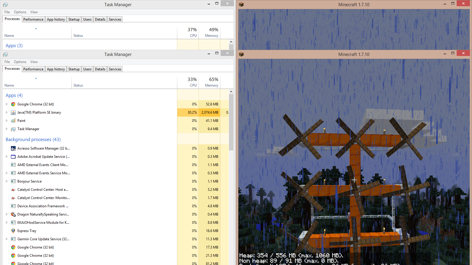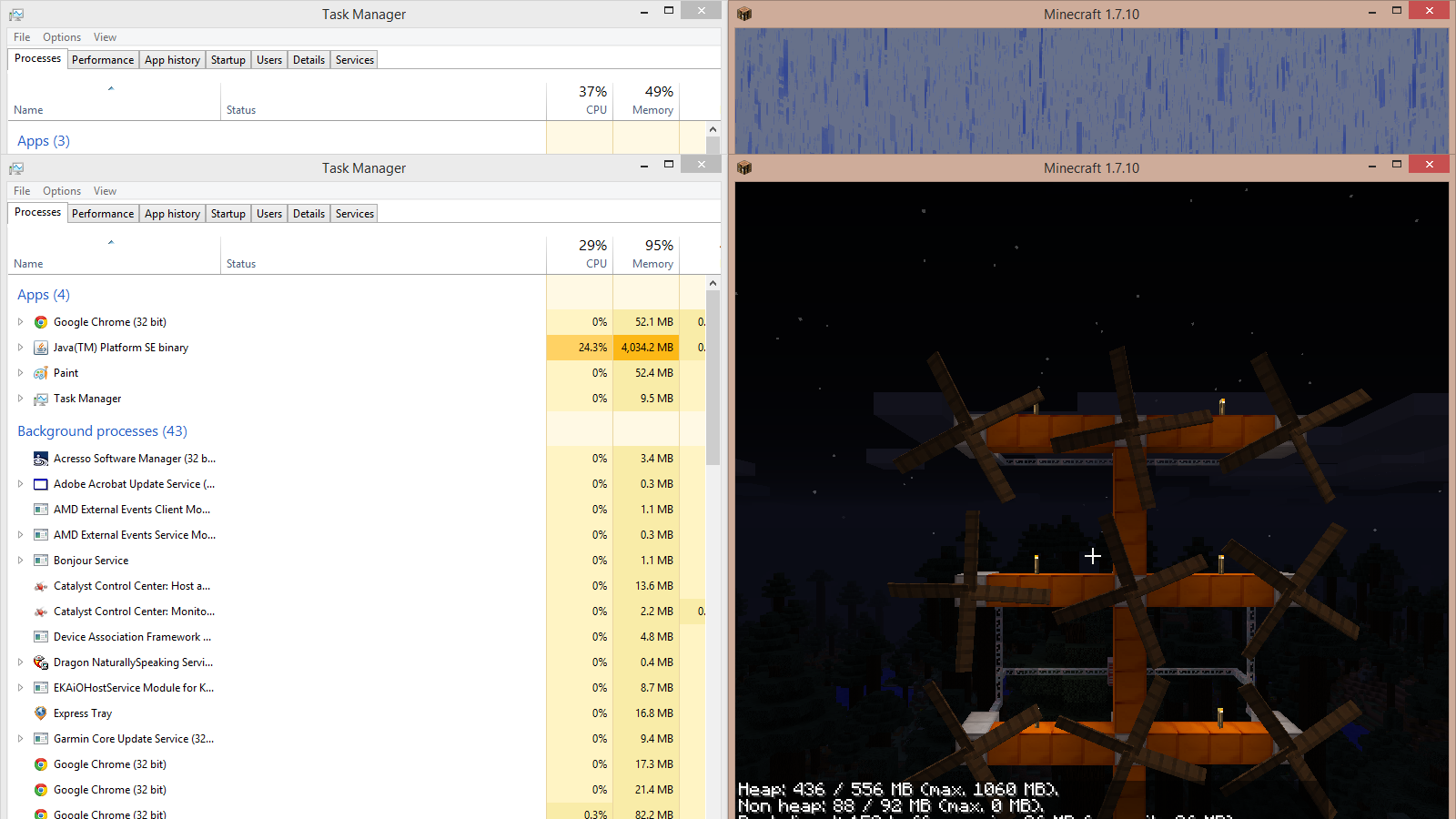 | Steps To Reproduce | - download minecraft, get version 1.7.10 started - isnteall minecraft forge 10.13.2.1232 (however older versions compatible with ic2 make no difference) - add ic2 2-2.2.653 to the mods folder - Start a new world - set a kinetic wind generator - fill a rotor in it and make sure it rotates - watch as the memory utilisation in the task manager increases endlessly (memory reported in minecraft itself stays normal) | ||||