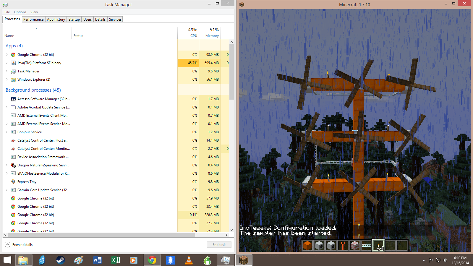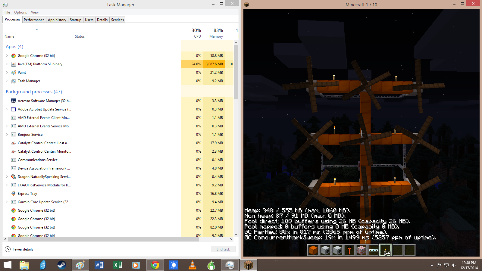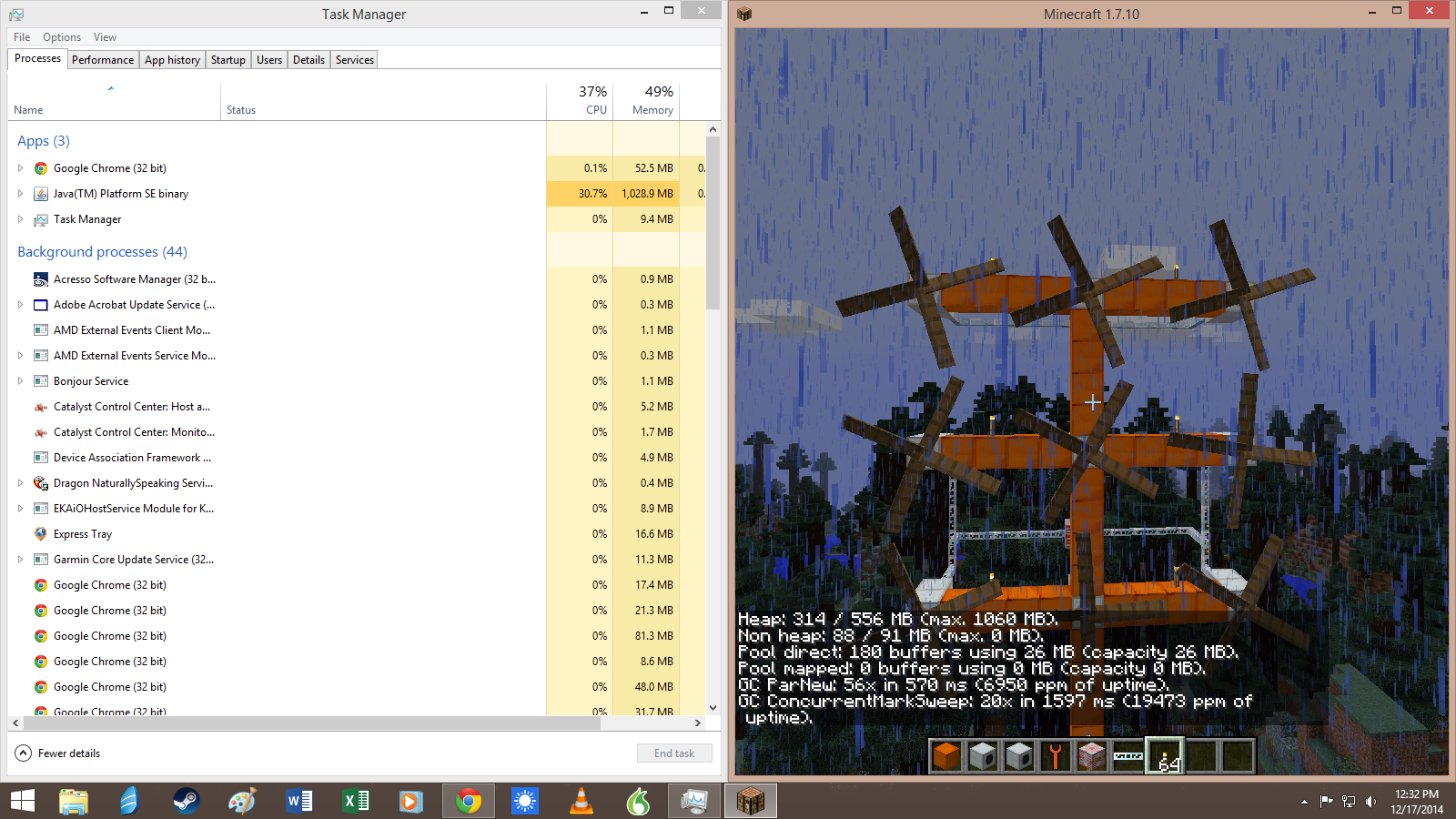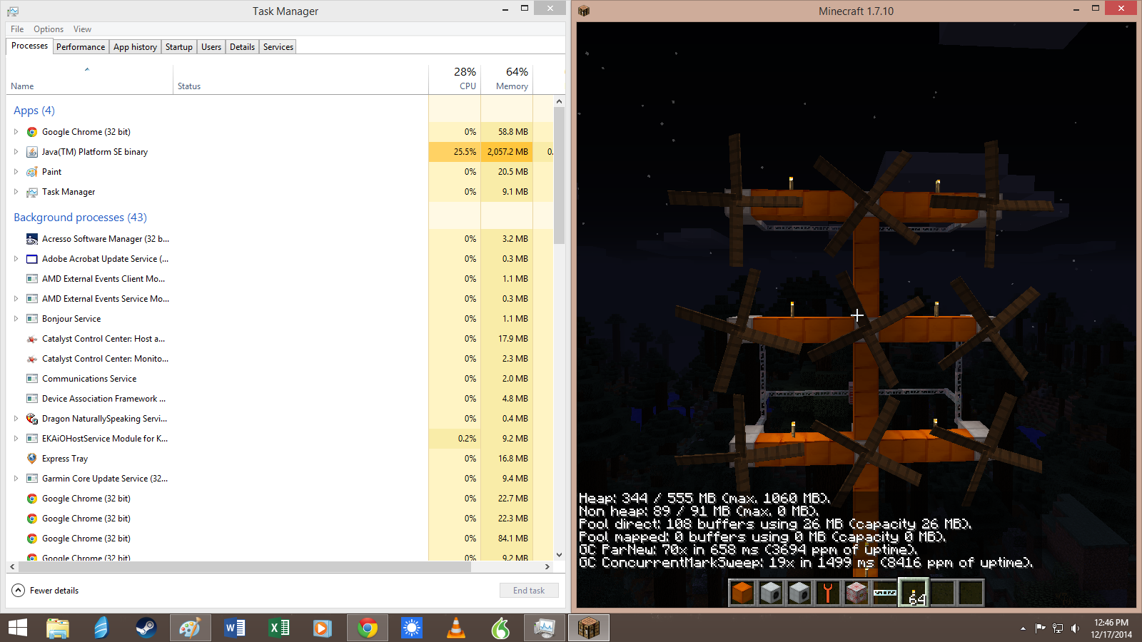 | Steps To Reproduce | - download minecraft, get version 1.7.10 started - isnteall minecraft forge 10.13.2.1232 (however older versions compatible with ic2 make no difference) - add ic2 2-2.2.653 to the mods folder - Start a new world - set a kinetic wind generator - fill a rotor in it and make sure it rotates - watch as the memory utilisation in the task manager increases endlessly (memory reported in minecraft itself stays normal) | ||||