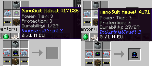 | Steps To Reproduce | Craft NanoSuit Helmet Add ingredients for Advanced Solar Helmet in following pattern: Top, Middle: Advanced Solar Panel 227 Middle, Left: Advanced Circuit 4126 Middle, Center: NanoSuit Helmet 4171 Middle, Right: Advanced Circuit 4126 Bottom, Left: Insulated Gold Cable 4198:3 Bottom, Center: LV-Transformer 200:3 Bottom, Right: Insulated Gold Cable 4198:3 | ||||