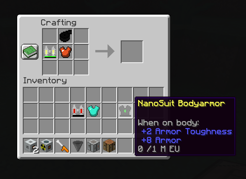 | Steps To Reproduce | Put in crafting grid: - Jetpack Attachment Plate - Electric Jetpack - NanoSuit BodyArmor | ||||