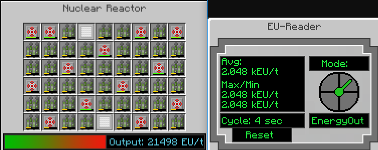 A EU reactor with high output(more than 1800 EU/t) can only be achieved by using condensators / coolant cells. Condensators need a lot of redstone / lapis, and coolant cells need extra reactors for cooldown(each reactor can only vent about 400 heat each second). Though they can generate a lot more EU, they require lots of materials to continuously run without explosions. They are more dangerous than fluid reactors because Nuclear Control is not updated. Fluid reactors have higher efficiency, so it is still a considerable option. . |
