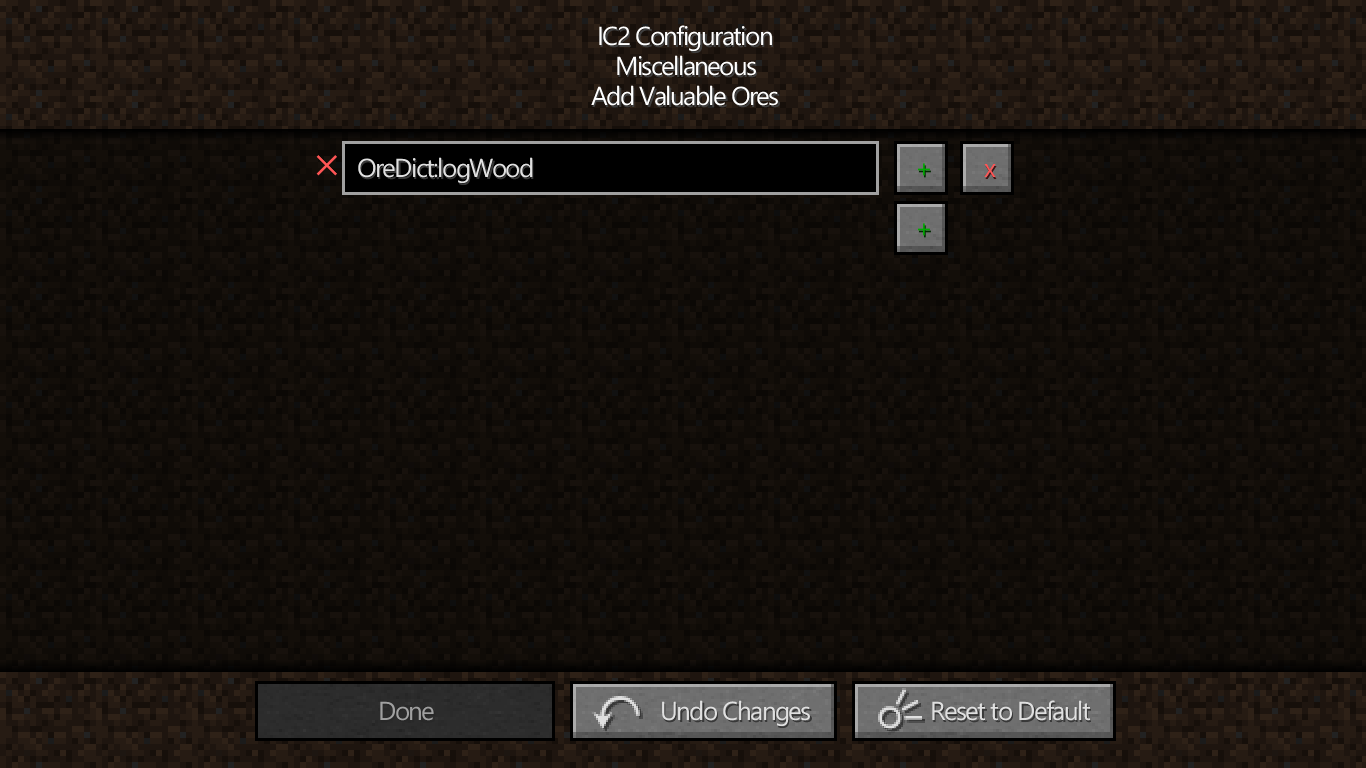 | Steps To Reproduce | 1. In main menu press <code>Mods - IC2 - Config - Miscellaneous - Add Valuable Ores</code> 2. Add something like <code>Oredict:logWood</code> 3. Try to save settings | ||||